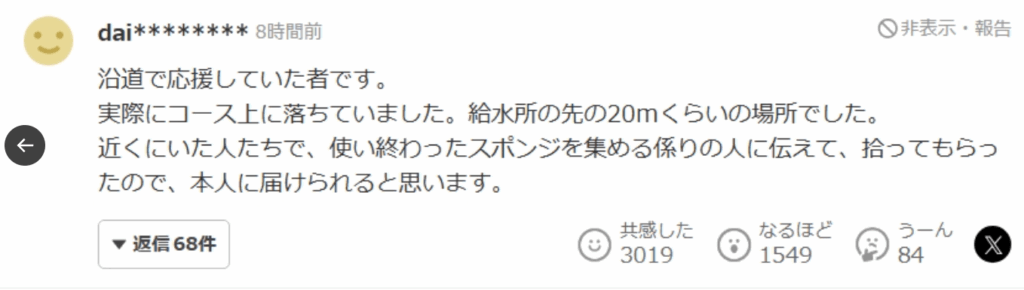 SNSに給水所の先の20mくらいの場所という情報がありました。